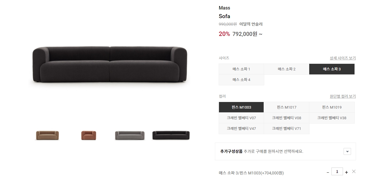 매스소파는 시각적 단순함을 주기 위해 곡선 부위에 최소한으로 적용된 원단의 절개 라인과 숨김 처리된 재봉선은 심플함을 더 해주었다고 합니다.매스 소파는 테디베어를 연상케 하는 모양으로 팔걸이, 등받이가 나누어지지 않고 둥근 곡선으로 연결되어 착석 시 몸을 탄탄하게 받쳐줍니다. 특히 컬러들이 다 매력적입니다. 깔끔한 것을 좋아하시는 분들은 블랙 저희는 아늑하고 따뜻한 분위기를 연출 하기위해 베이지색인 핀스1003컬러를 눈여겨 보고 있었습니다.
