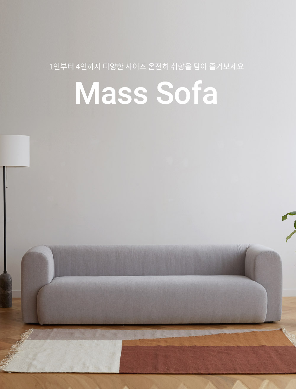 위의 사진은 공식홈페이지의 사진을 가져왔습니다. 사진에 나와있다 시피 사이즈는 1인부터 4인까지의 폭넓게 선택이 가능하고요. 저희 부부는 매스 소파 3 사이즈를 구입하였습니다.