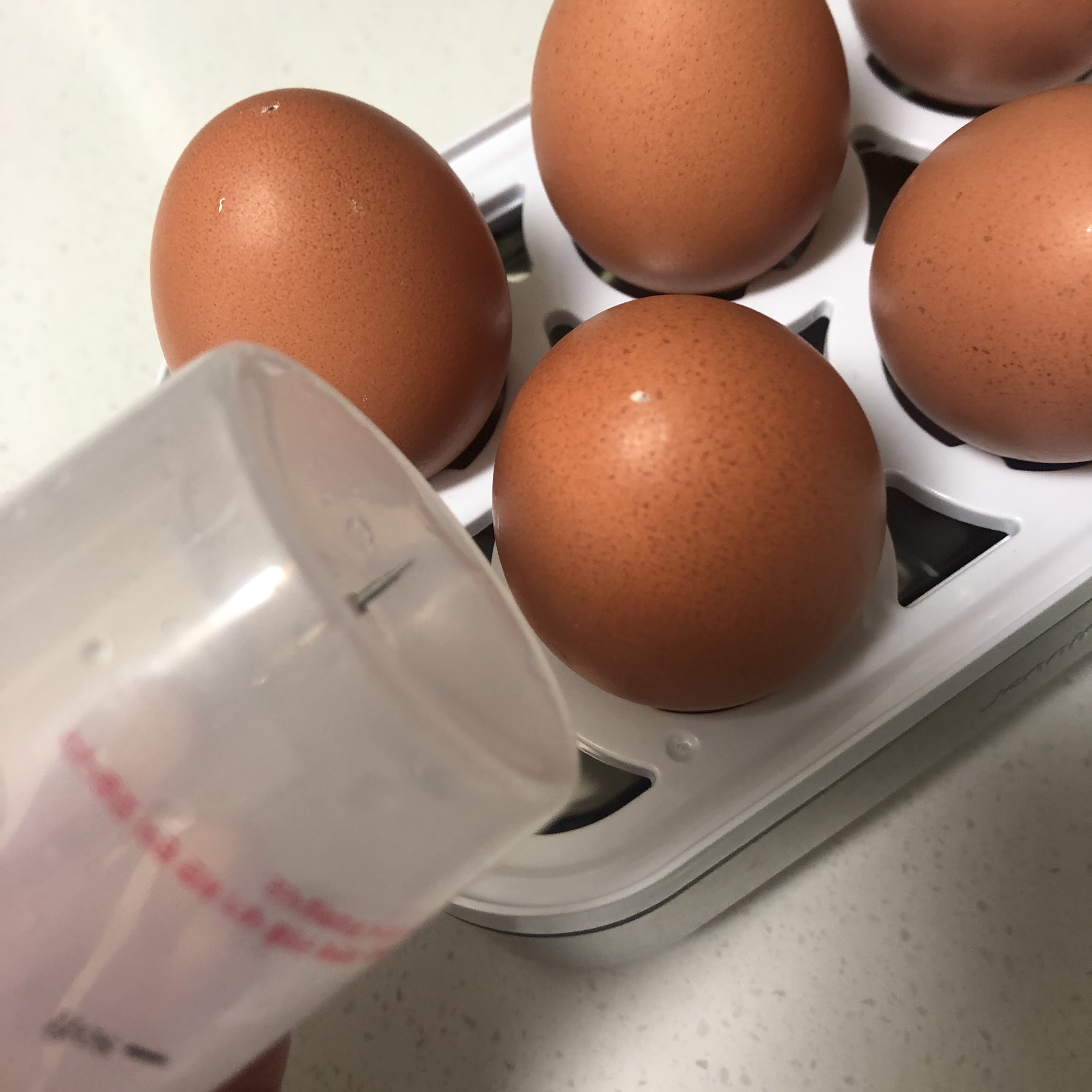 1. 계란을 준비하시고 반숙의 경우 물컵의 중간 부분까지 채워주시면 됩니다. (눈금으로 표시가 되어 있습니다.)