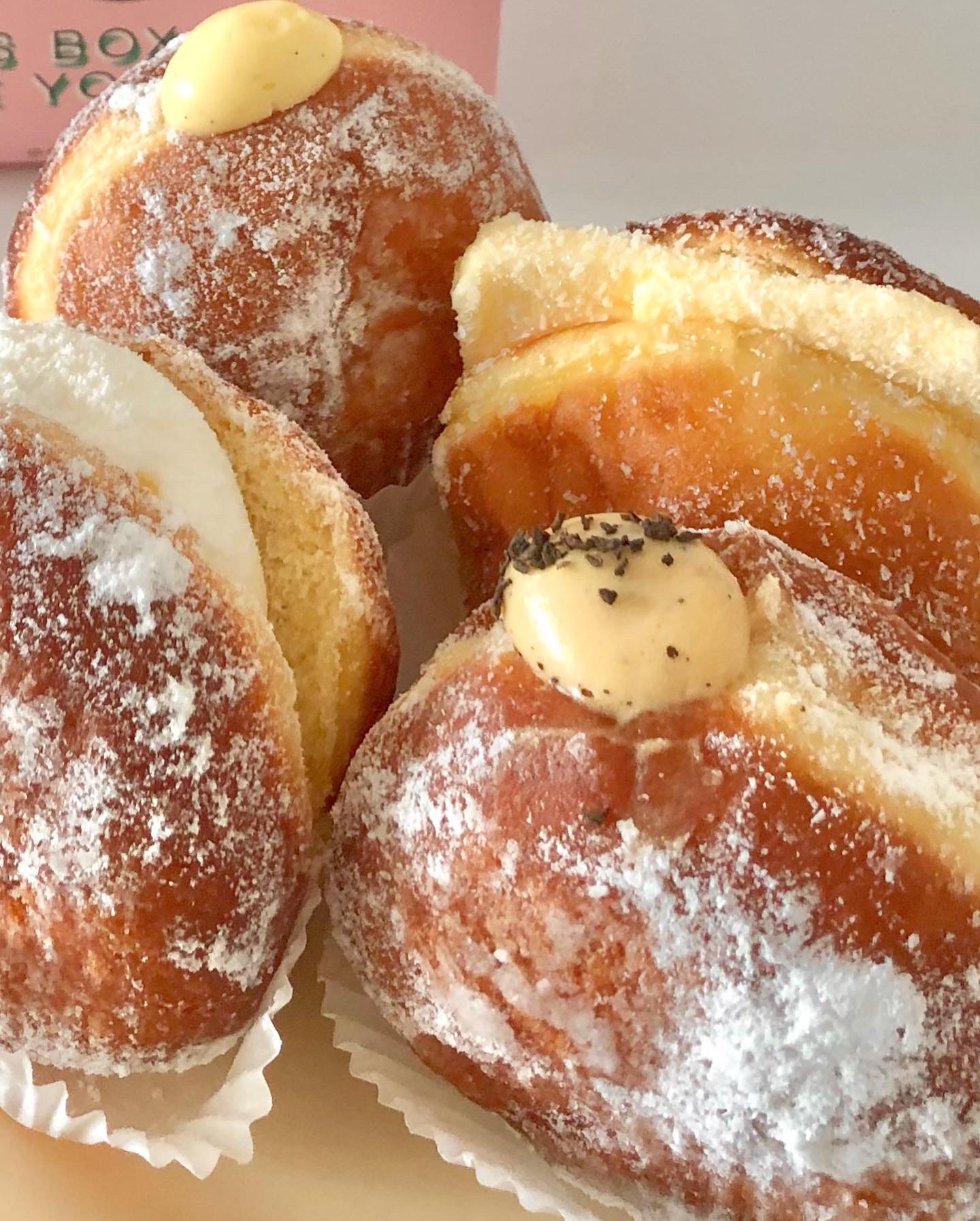 제일 인기 있고 시그니처 도넛인 우유 크림 도넛이 눈에 띄는 것 같습니다. 우유 크림이 꽉 차 있습니다.