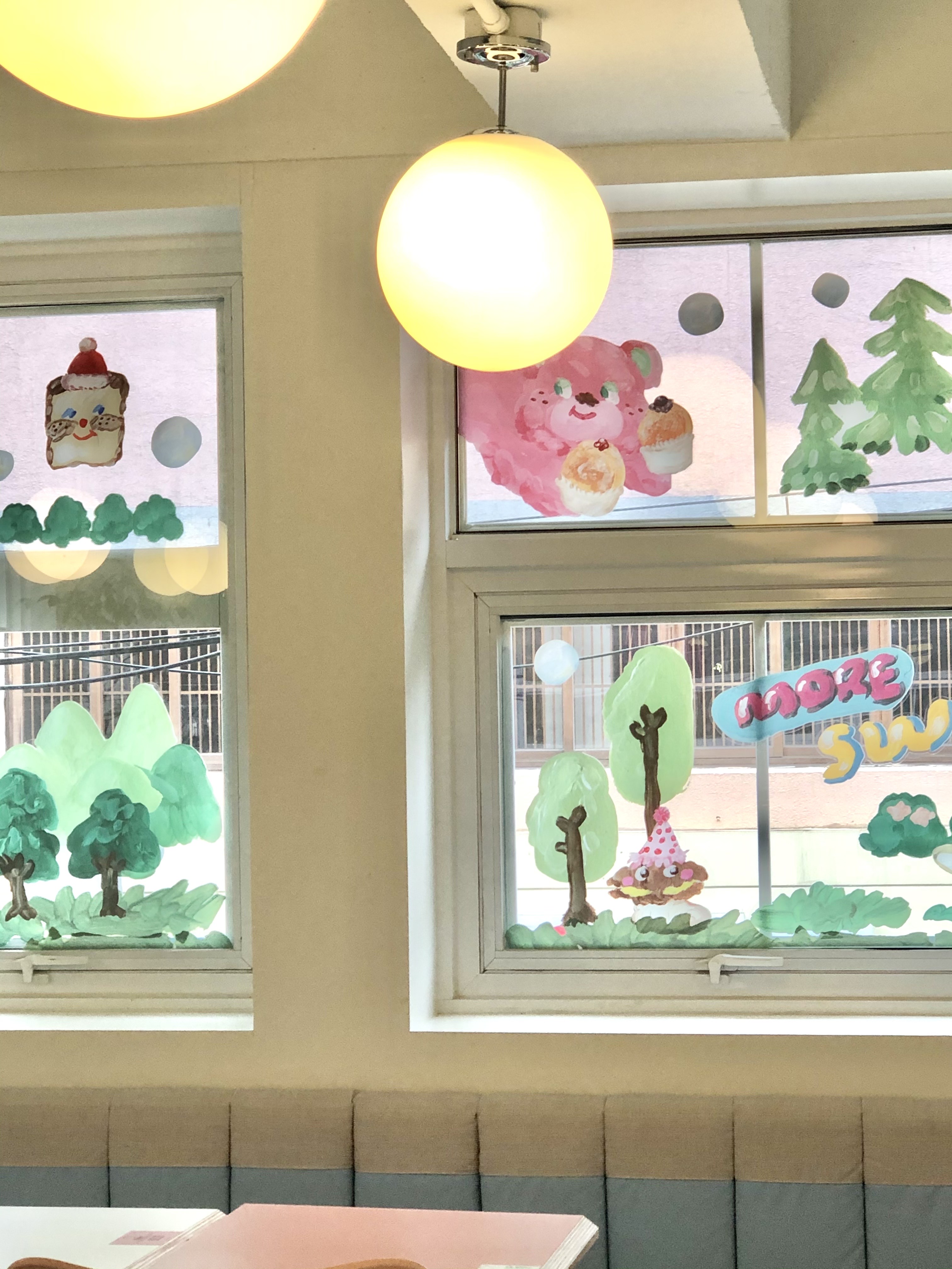 들어가자마자 너무 러블리한 분위기의 인테리어들 핑크 노랑 등의 파스텔톤으로 이루어져 있고 특히 일러스트가 너무 예쁩니다. 귀여운 곰돌이가 예쁜 일러스트로 곳곳에 꾸며져 있습니다.